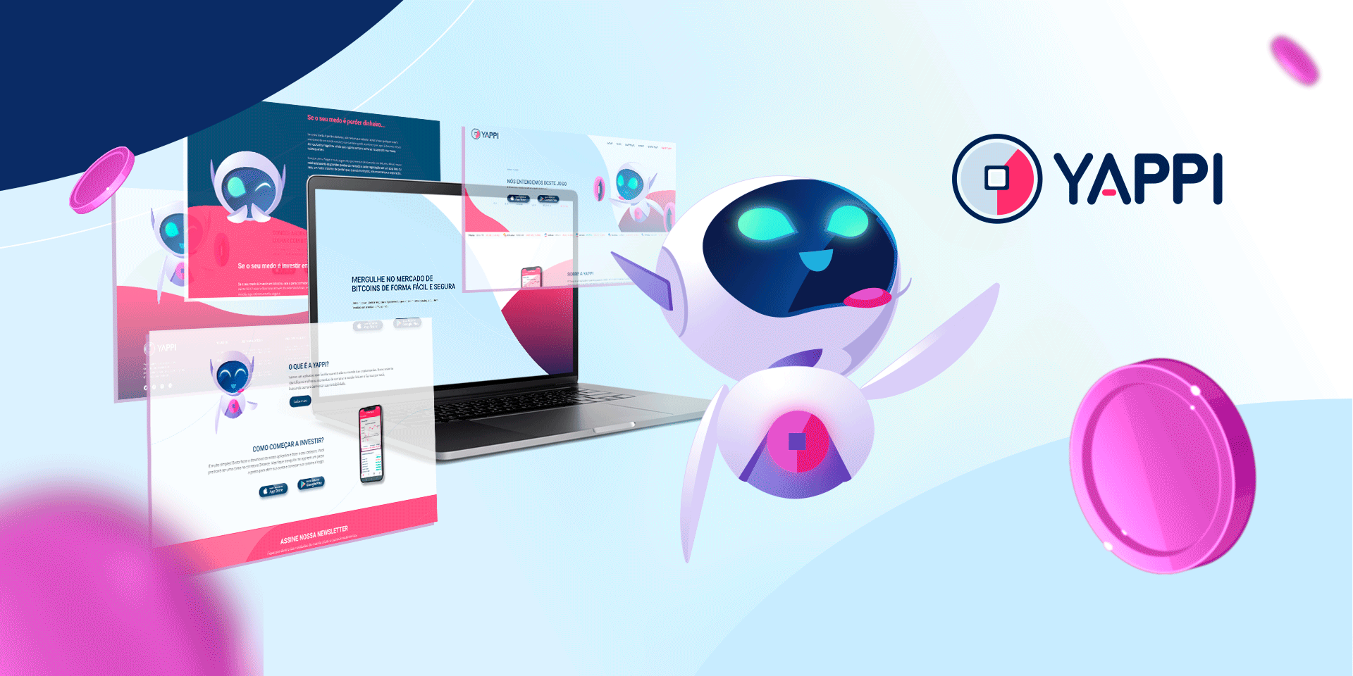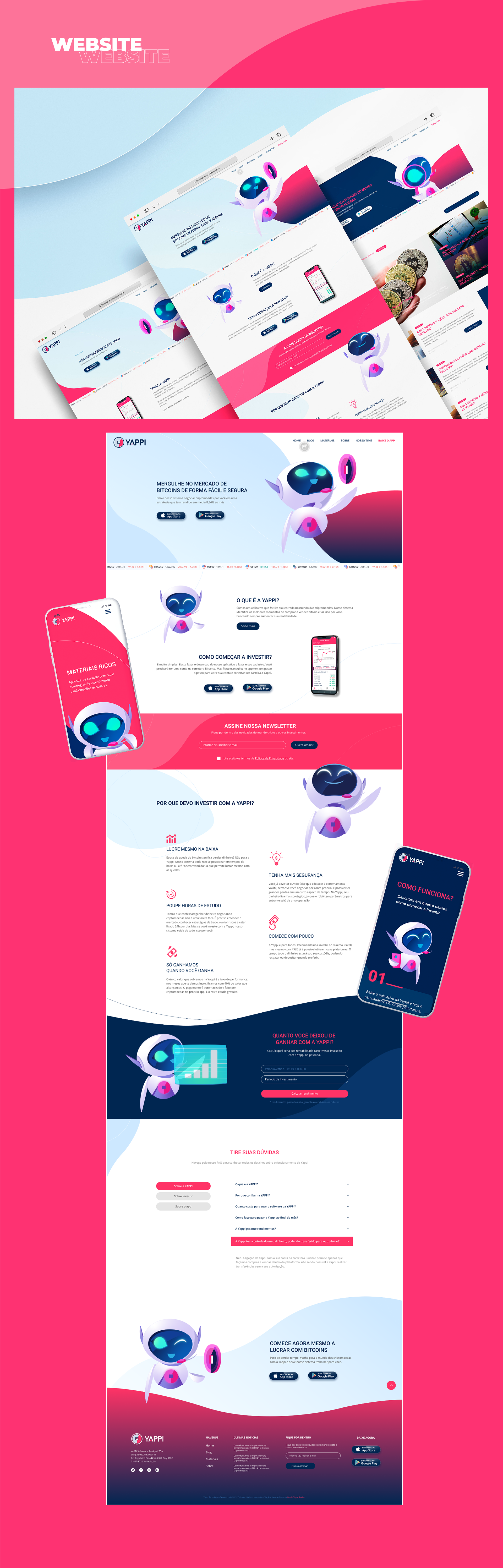 A empresa nascia com a missão de tornar o universo das criptomoedas mais acessível e menos intimidador para novos investidores. Criamos uma linguagem visual confiável e acolhedora, guiada por um mascote que humaniza a experiência. O site apresenta a proposta da Yappi de forma clara e dinâmica, traduzindo tecnologia em orientação simples para quem está entrando no mercado cripto pela primeira vez.